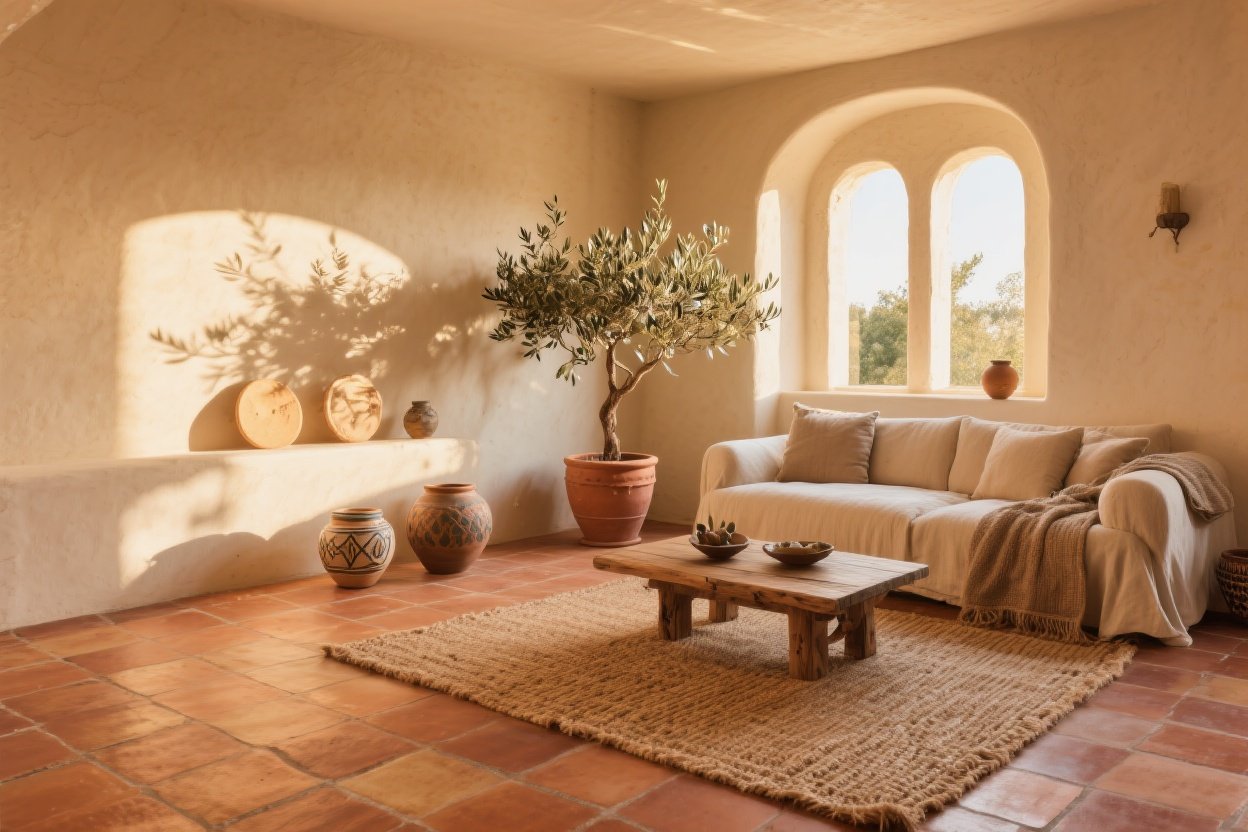 - Keep walls warm white (think parchment, not paper) to flatter the clay tones.