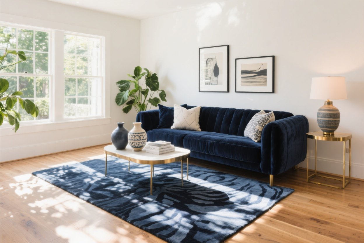• Coffee table: Stack a navy book, a small vase, and a candle for a simple vignette.
