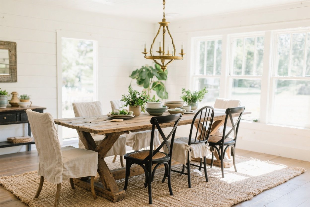 - Slipcovered host chairs + trestle: Comfy and elevated for long dinners.