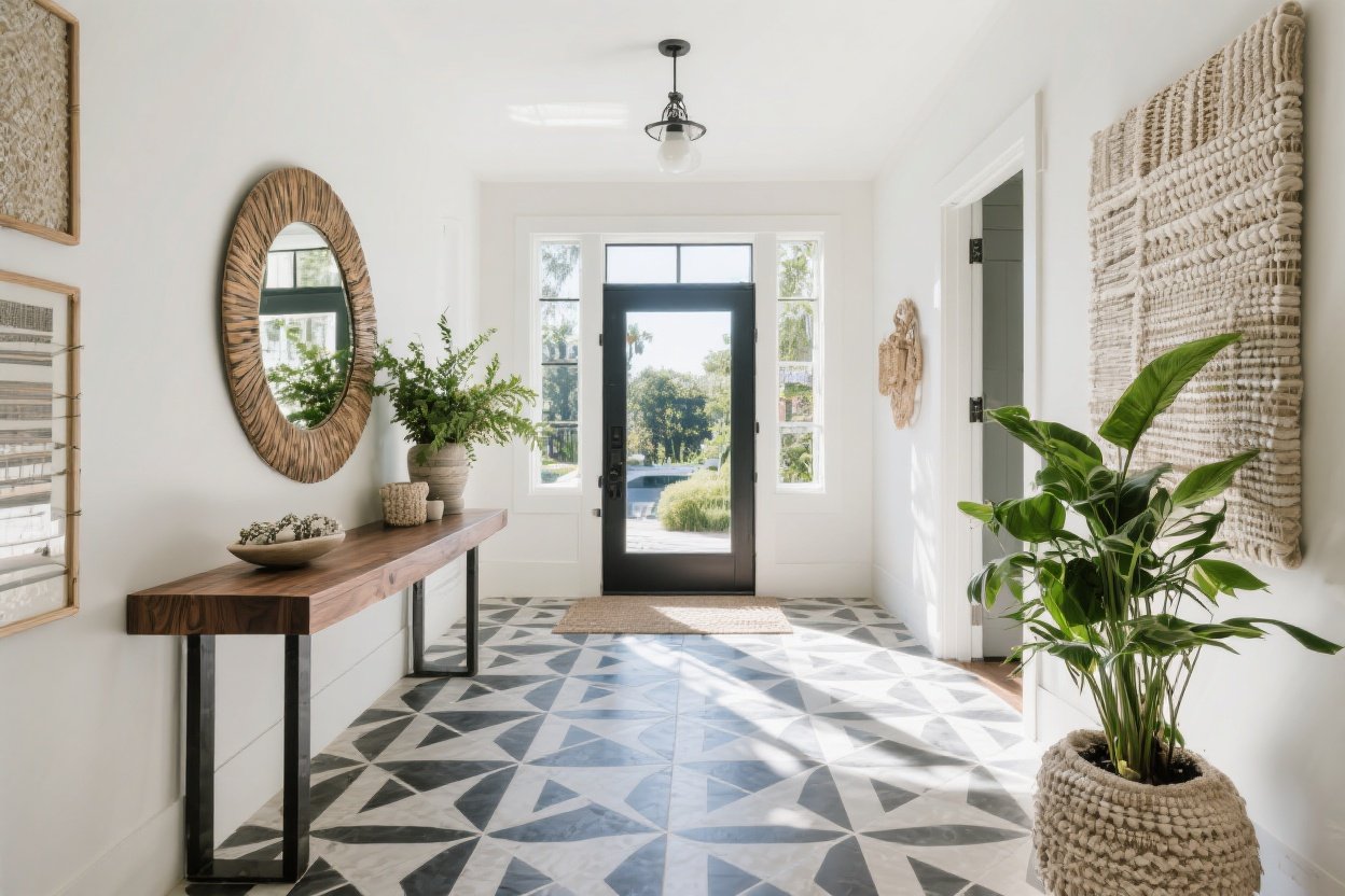 High-contrast black-and-white tiles are like a graphic tee for your floor—classic, punchy, and always cool. Think hexagons, chevrons, or checkerboards that instantly give your entry structure and style.