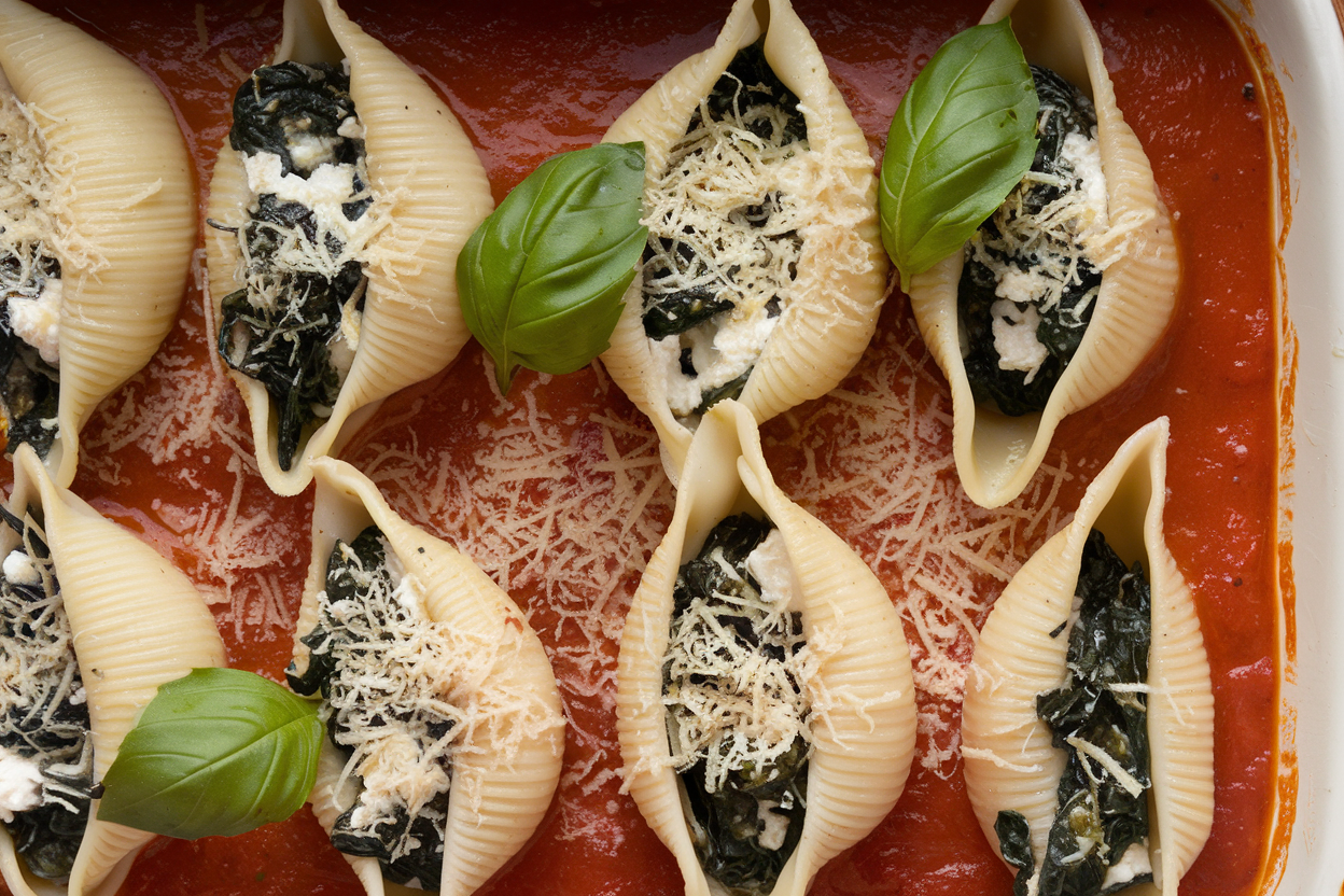 5. Layer and bake: Spread marinara in a baking dish, add shells seam-side up, top with more sauce and cheese. Bake at 375°F for 25–30 minutes.
